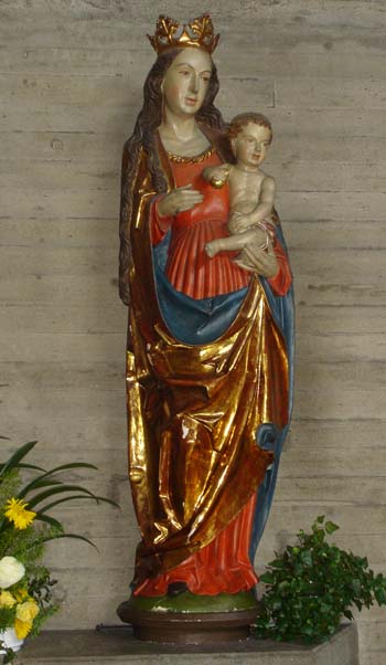 Die Madonna im Seitenaltarbereich ist eine Nachschnitzung. Das kleinere Original befindet sich in der Schatzkammer des Münsters Schwäbisch Gmünd. Der Schnitzer Josef Wolfsteiner ist sehr gut verwurzelt in der Region und unserer Gemeinde. Er stammt aus Hüttlingen und machte zwischen 1925 und 1928 seine Ausbildung zum Bildhauer und Figurist, 1937 erhielt er seinen Meisterbrief. Die Madonna der Marienkirche zeichnet sich durch ihren klaren und aufrichtigen Blick aus, welchen das Jesuskind ebenfalls hat. Beide schauen in dieselbe Richtung, sodass der Betrachter spürt, dass sie wissend sind und souverän.
