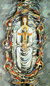 Das Spannende bei diesem Doppelfenster ist, dass es sich für das Motiv von Anna, Maria und Jesus abermals der apokryphen Schriften bedient. Anna ist der Legende nach die Mutter Marias, das Bild zeigt sozusagen einen Besuch der Großmutter.