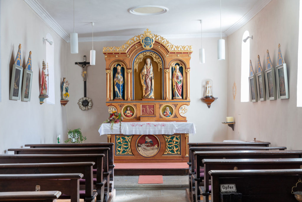 Beim Betreten der Kapelle fällt der Blick sofort auf den Hauptaltar. Die Mittelfigur des Tryptichons stellt Maria Magdalena, eine der Jüngerinnen Jesu, mit Salbgefäß dar (spätgotisch). Ihr Gedenktag wurde 2016 durch ein Dekret von Papst Franziskus zum Fest erhoben, wodurch sie liturgisch den Aposteln gleichgestellt wurde. Die Heilige Magdalena wird angerufen, wenn Gewitter droht oder wenn Ungeziefer das Haus befällt.