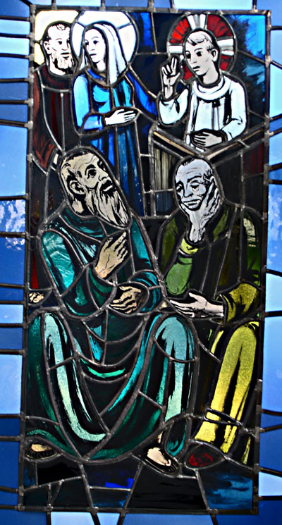 Die letzte Szene der Fenster auf dieser Seite zeigt den zwölfjährigen Jesus im Tempel. Diese Szene ist dem Lukasevangelium entnommen: Lk 2, 46-52: »Da geschah es, nach drei Tagen fanden sie ihn im Tempel; er saß mitten unter den Lehrern, hörte ihnen zu und stellte Fragen. Alle, die ihn hörten, waren erstaunt über sein Verständnis und über seine Antworten. Als seine Eltern ihn sahen, waren sie voll Staunen und seine Mutter sagte zu ihm: Kind, warum hast du uns das angetan? Siehe, dein Vater und ich haben dich mit Schmerzen gesucht. Da sagte er zu ihnen: Warum habt ihr mich gesucht? Wusstet ihr nicht, dass ich in dem sein muss, was meinem Vater gehört? Doch sie verstanden das Wort nicht, das er zu ihnen gesagt hatte. Dann kehrte er mit ihnen nach Nazaret zurück und war ihnen gehorsam. Seine Mutter bewahrte all die Worte in ihrem Herzen. Jesus aber wuchs heran und seine Weisheit nahm zu und er fand Gefallen bei Gott und den Menschen.«